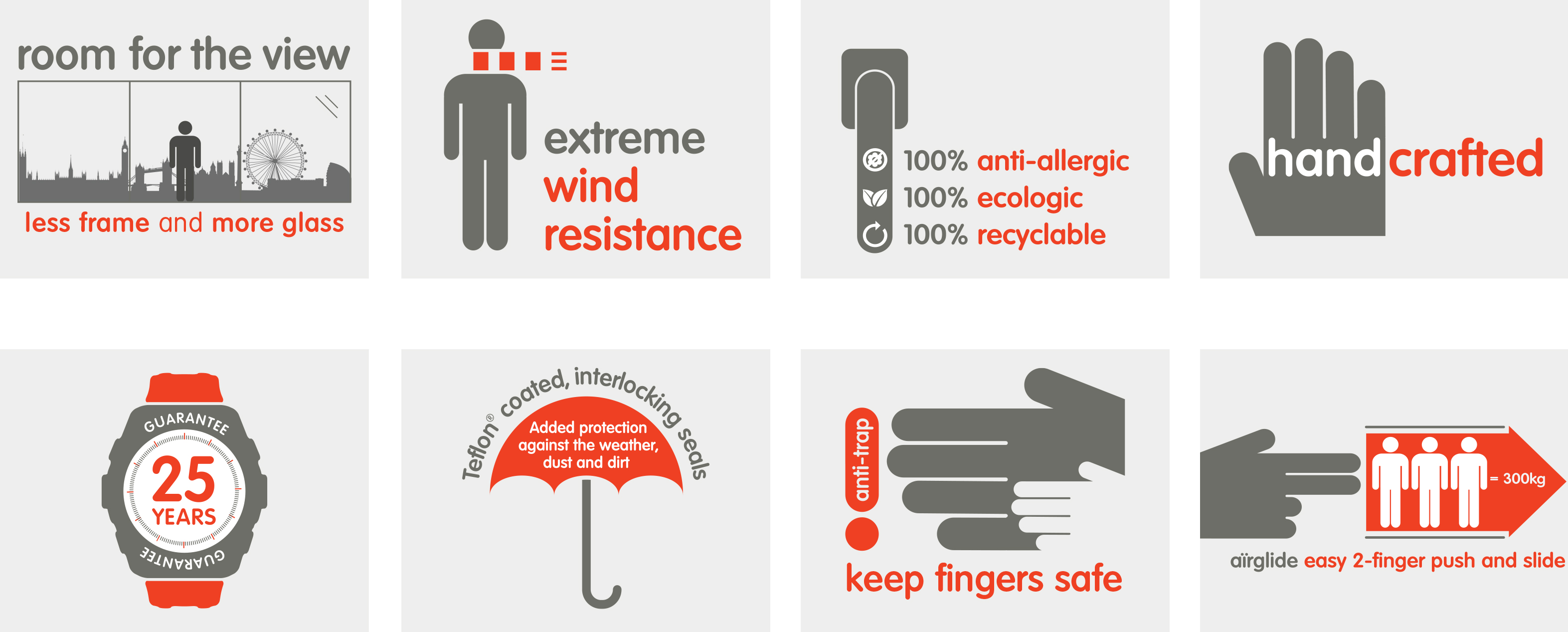 aïr 800 has outstanding thermal efficiency, with Teflon-coated, interlocking double weather seals, making the door airtight and keeping bad weather at bay. aïr’s performance has been proven in tests. They are wind-tested to 1800 pa and watertight to 600 pa.